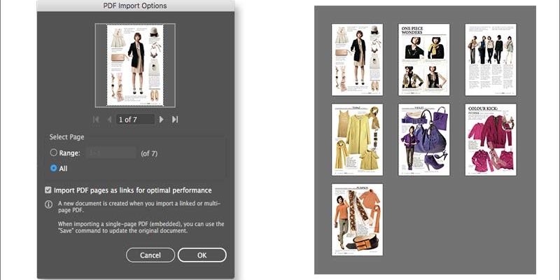 In dem Import-Dialog, der nun erscheint, wählst Du aus, ob Du eine, mehrere oder alle Seiten der PDF-Datei importieren möchtest. Aktiviere die Checkbox, wenn Du die Seiten als Verlinkung importieren möchtest. Anderenfalls werden sie in das Dokument eingebettet.